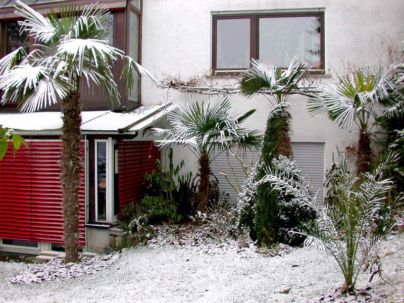 mal sehen wann die phoenix rechts vorne verendet. alles bislang ohne schutz. die nektarine hat endlich den geist aufgegeben. die wollmispel hängt vom schnee, die zypresse auch, der lorbeer noch topp, granatäpfel auch endlich entlaubt, die rechte trachy wächst noch wie blöd - siehe hellgrün-gelbes blatt.