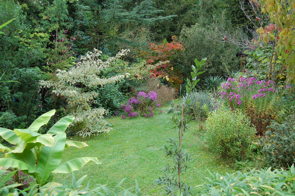 fast der gleiche Standort wie eben nur mit Blick nach Westen,Li Cornus controversa Variegata, i.d.M. die stahlblaue Yucca x karlsruhensis, hi die gut 6m hohe Quercus phillyreoides-Eiche AM#