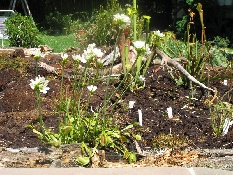 /*Dionaea muscipula*/ fängt nicht nur Insekten, sondern blüht auch! Sie ist nicht nur bei den Kindern beliebt, da sie ähnlich der bekannten Mimosen, zu einer recht schnellen Bewegung fähig sind. Dank Christian/Südpfalz konnte ich das Moorbeet gleich mit ein paar kapitalen Tuffs nicht nur dieser Pflanze bestücken.