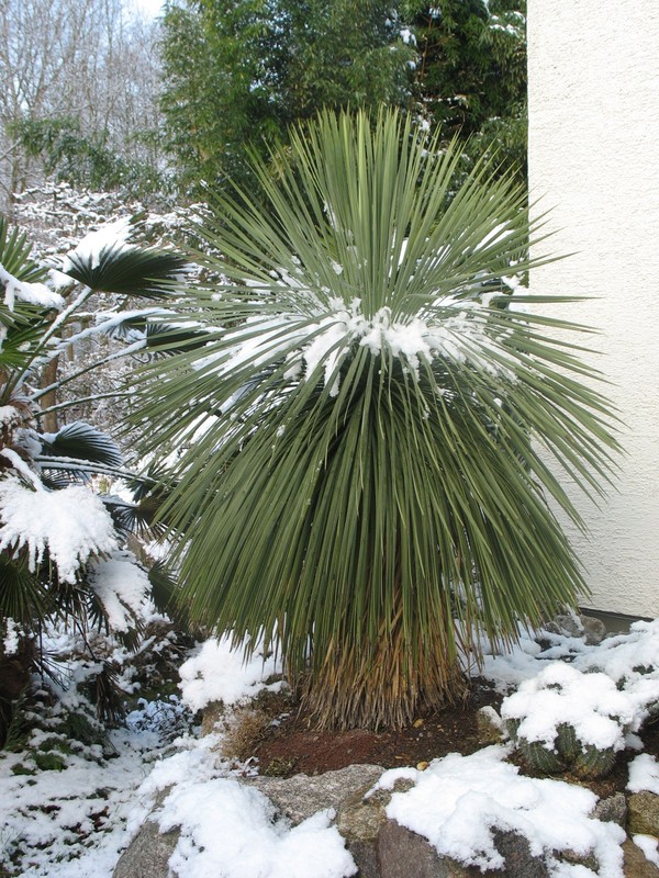 ..vor der Südfassade ist es bereits am Vormittag weitgehend weggetaut. Die knackige Frostperiode war hier kein Problem, aber die jetzige Wetterlage mit ständigem Schnee und Abtauen in Folge halte ich für äußerst gefährlich für div. Yuccas und Sukkulenten. Das hat schon vor 3 Jahren zu großen Ausfällen geführt.