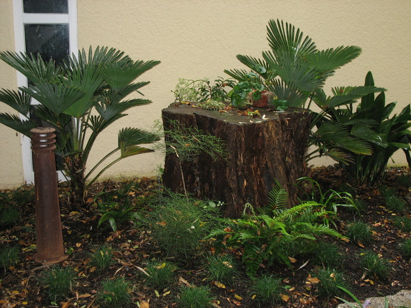 weil diese Palme beim Gartenbesitzer so gut ankam, wurde dieses Frühjahr der Stumpf einer abgängigen alten Robinie asiatisch umpflanzt mit 2 x T. wagnerianus, Nandina domestica 'Orhime' Aspidistra in 3 Arten und Ophiopogon japonicus - und hinter dem Stumpf gerade noch sichtbar zur Wandbegrünung der immergrüne Selbstklimmer Pilostegia viburnoides