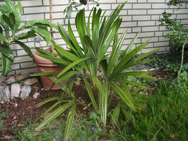 ...seit 2001 ausgepflanzt auf der Ostseite des Hauses. Sie hat auch den harten Winter 02/03 muehelos weggesteckt.Allerdings schuetz die Naehe zur Hausmauer und ein kleiner Dachueberstand. Meiner Meinung nach ist die die einzige wirklich bedenkenlos auspflanzbare Palme fuer den Norden. Das Bild ist vom Juni und sie hat in diesem Saison immerhin bisher 3 Blaette neu geschoben und das vierte oeffnet sich gerade.