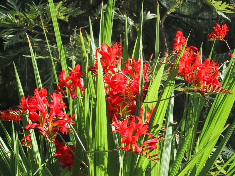 Crocosmia masoniorum Lucifer steht seit Jahren im Garten ohne Schutz und sieht einfach exotisch aus!! (Ziemlich hoch werdend, ca 1m u. mehr,hier vor Quercus dentata pinnatifida)