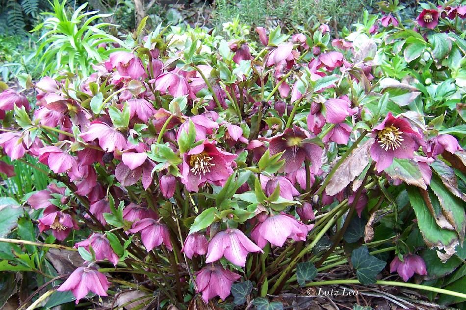 Kräftiges Polster einer violet/dunkelrot blühenden Heleborus-Staude.