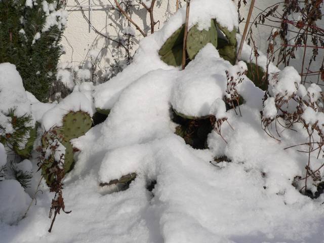Immer ein exotischer Anblick, der Passanten ins Staunen versetzt:  Opuntia hybr. Cottbus