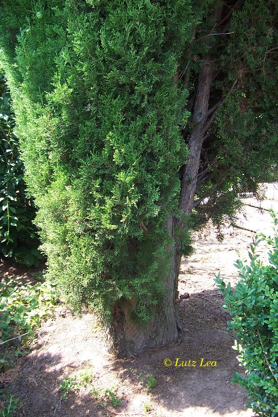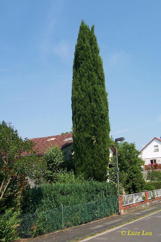 Fast perfekt gewachsen gedeiht jene in dem dortigen Vorgarten mit gut einer Höhe von 15 m und kräftigem Stammanlauf! Über das Pflanzjahr (Alter) der Zyprese konnte ich wegen Zeitmangel leider nichts in Erfahrung bringen.