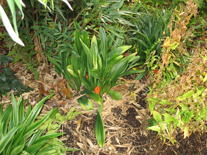 vor Mahonia fortunei. Rechts Rohdea j. 'Galle'