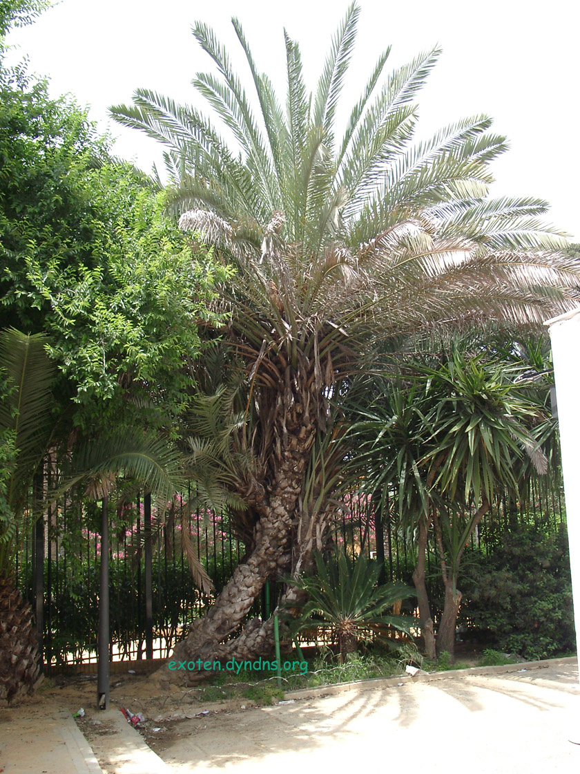 Wohlgemerkt, dactylifera ist i.a. stark ausläufertreibend, das ist nicht gemeint, sondern verzweigter Wuchs. Allerdings im Ggs. zu Bildern von verzweigten Trachys gab es hier einen Hauptstamm, von denm gelegentlich ein Seitenstamm (auf unterschiedlichen Höhen) abzweigte.
