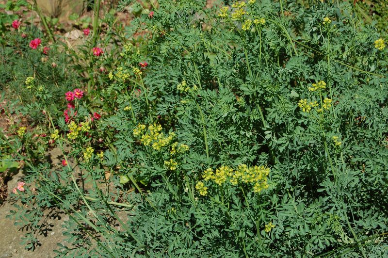 /*Ruta graveolens*/ die Weinraute passt ebenso wie Salbei, Lavendel und Cistus in den mediterranen Garten (IM Hintergrund Helianthemum)