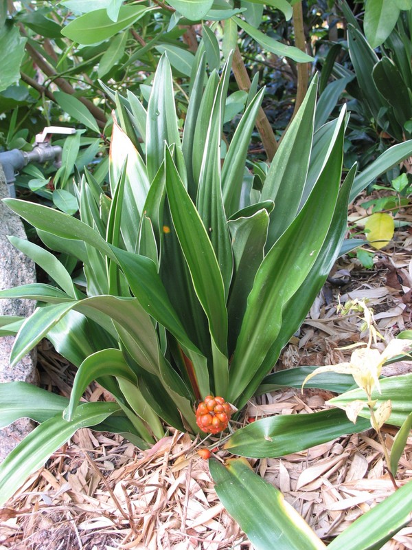 färbender Fruchtstand von Rohdea japonica 'Miyako No So'. Diese Sorte hat bei mir eine Höhe von 65 cm erreicht.