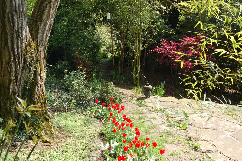 /*Acer palmatum Shindeshojo*/ mit Tulpen und Moso re, ein "stilles Örtchen"