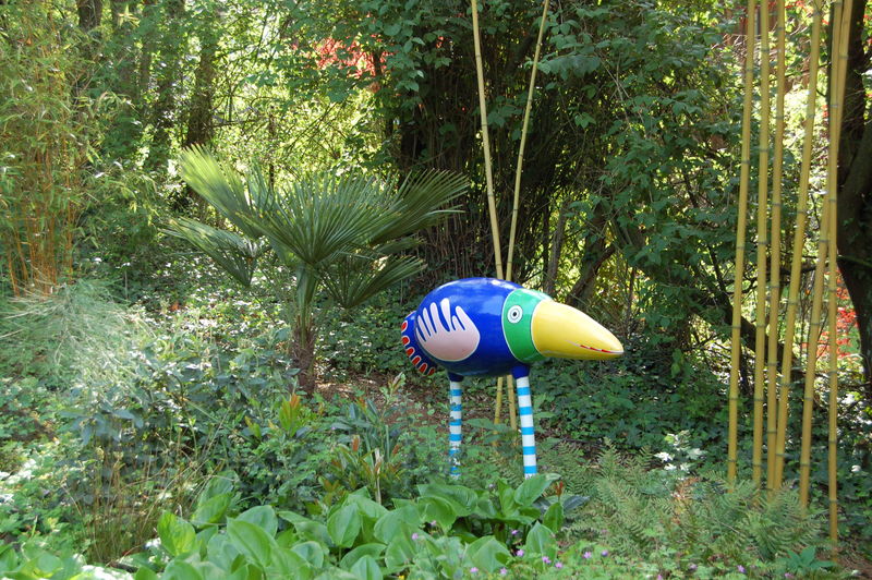 /*Phyllostachys viridis Robert Young*/ re neben Kunst im Garten (Paradiesvogel ca 120cm hoch),wunderschön gewachsene Trachycarpus takil? (mit schrägem Stammansatz),li Phy.aureosulcata spect.