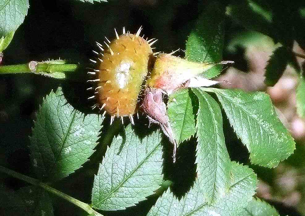 /*Rosa roxburghii*/ fällt durch ihre gelben, rundlichen, borstigen Hagebutten auf.