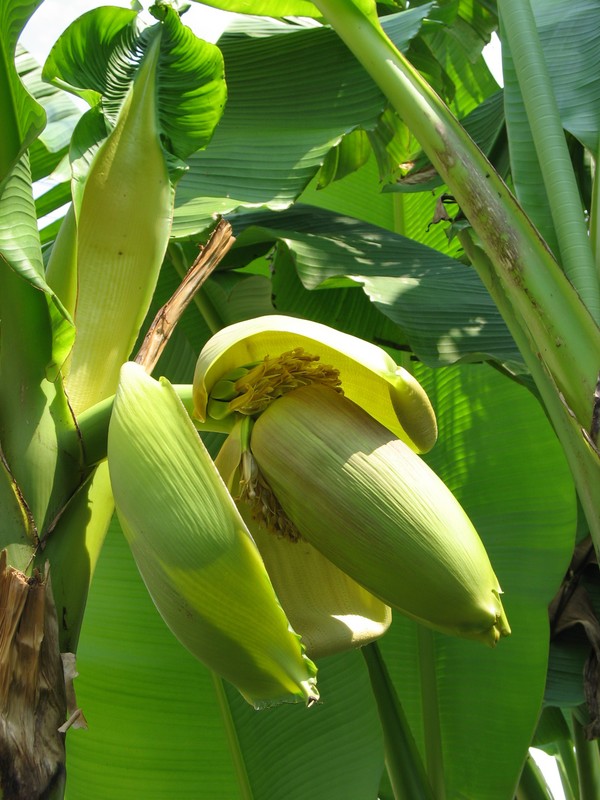 die Blüte meiner /*Musa basjoo*/ hat nur auf die Sonne gewartet. Heute morgen konnte man zusehen wie sich die Knospe öffnete und die erste Reihe weiblicher Blüte zum Vorschein kamen