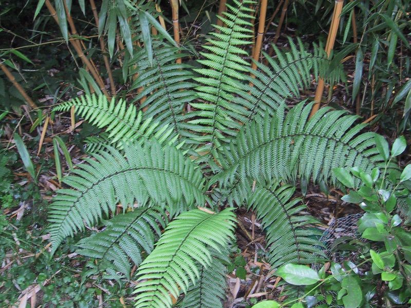 Fast 1,8 m breiter Himalaya-Schwarzschuppenfarn vor Phyllostachys vivax aureocaulis