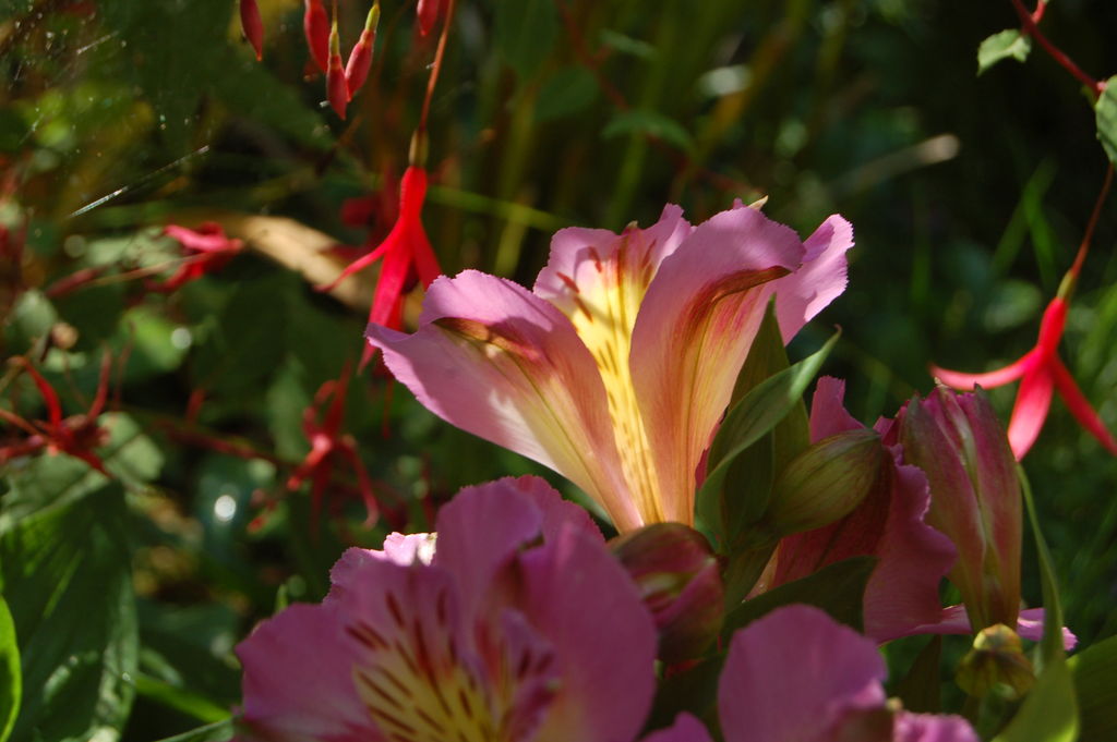 zum Schluss doch noch eine Nahaufnahme von heute:/*Alstroemeria-Hybride*/ mit Fuchsia magellanica.Das Licht war so schön!!