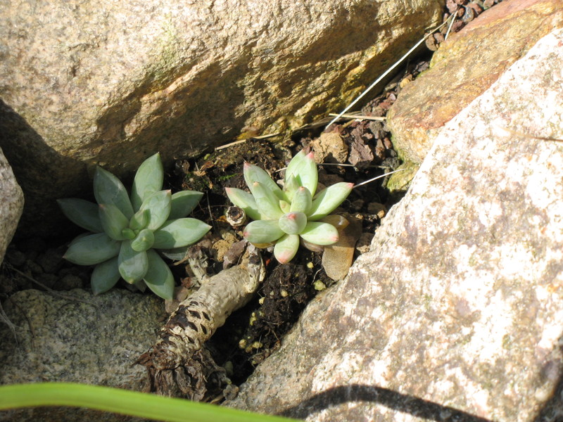 gibt es immer wieder. Nachdem der lange nasse schneereiche Winter vor 2 Jahren all meine Echeverien dahingerafft hat, kehrt eine eine Pflanze -vermutlich eine Pachyphytum-Art (aus einer bunten Echeverien-Mischung) - aus mm-großen Anfängen unendlich langsam zurück.
