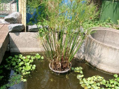 Echter Papyrus, links Wasserhyazinthen, rechts Wassersalat: