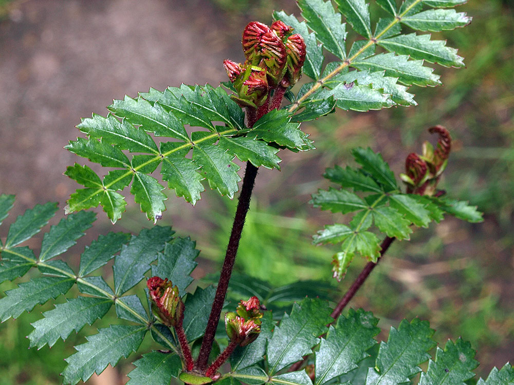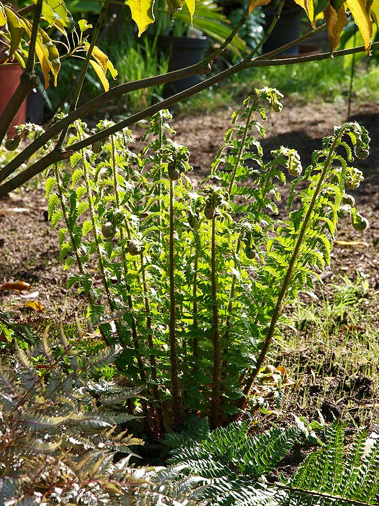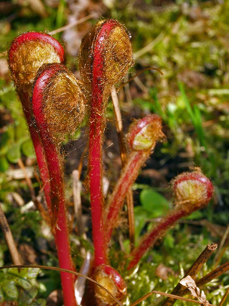 /*Osmunda cinnamonea var. fokinensis*/ in rot als kleines Kontrastprogramm.