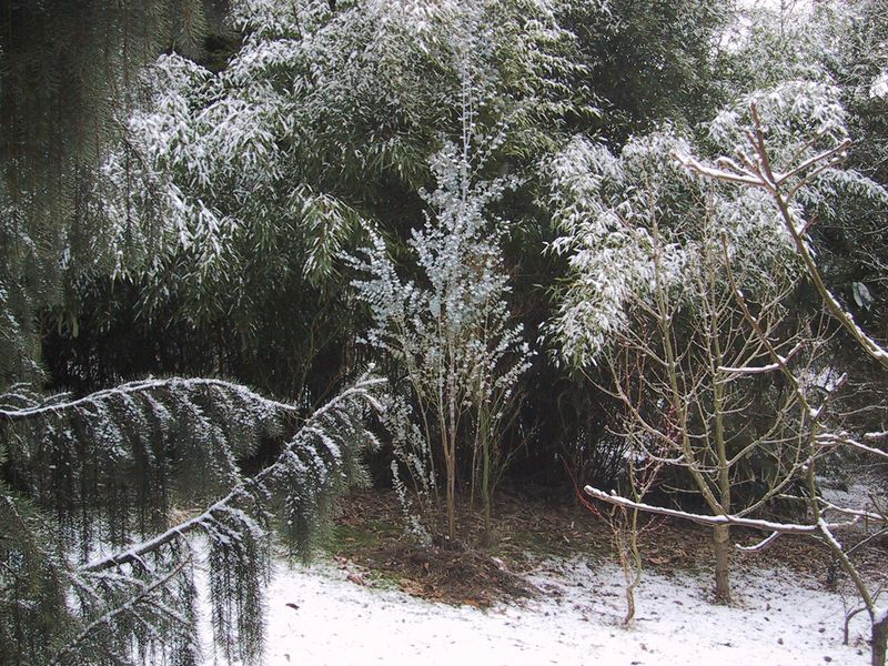 Mein alter Eucalyptus, der nach dem kalten 96er Winter völlig abgefroren war u. aus dem Lignotuber wieder "auferstanden"ist.Im Hintergrunf Phyllostachys nigra Boryana (bis 7m hoch) u.vorne Picea breweriana