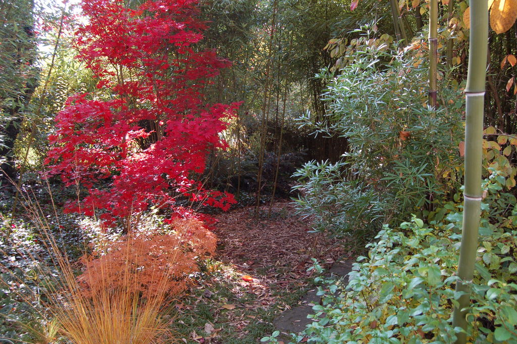 /*Acer palmatum Red Trompenburg*/ und davor /*Acer palmatum Filigree*/,re Vivax und zentral Molinea coerulea Moorhexe
