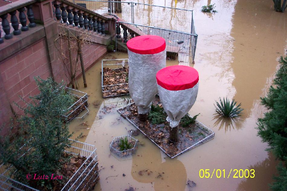 Damals lief so ziemlich alles voll was volllaufen konnte. So weit ich mich an die Aussage von Herrn Reiner Gesell erinnern kann, gab es erstaunlicherweise an den Pflanzen und Palmen keine nennenswerte Schäden! Das war/ist kaum zu glauben. Am 'Eisernen Steg' (Treppenabgang= viele Tafeln mit Hochwassermarken)! wurde die Marke von 1972 knapp verfehlt.
