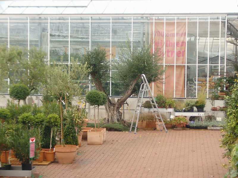 Hier noch ein Olivenbaum einer anderen Gärtnerei in der Stadt, auch an einem Gewächshaus gepflanzt.