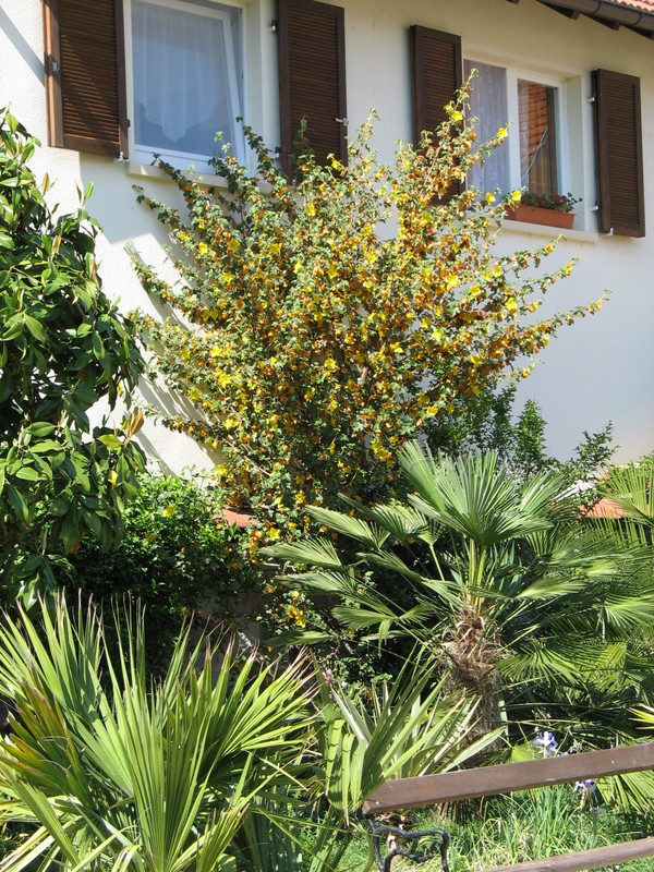 Blind vor lauter Palmen und die Digicam bereits weggepackt, ging dann der Blick doch noch nach oben: Hei, was blüht denn da so gelb im Hintergrund - das ist doch wahrhaftig ein kapitaler /*Fremontodendron californicum*/