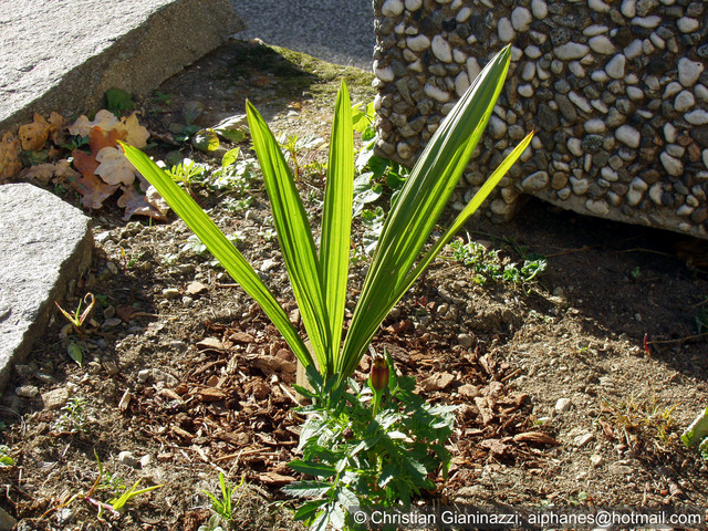 /*Butia capitata var. strictior*/ Diese Palme sieht aus der Ferne wie eine Phoenix sp. aus. B. c. var. strictior bietet den Vorteil, das sich die Blätter (im Falle von Winterschutz) sehr gut zusammenbinden lassen (was bei der Gattung Butia sonst eher mühsam sein kann, besonders bei grösseren Exemplaren).
