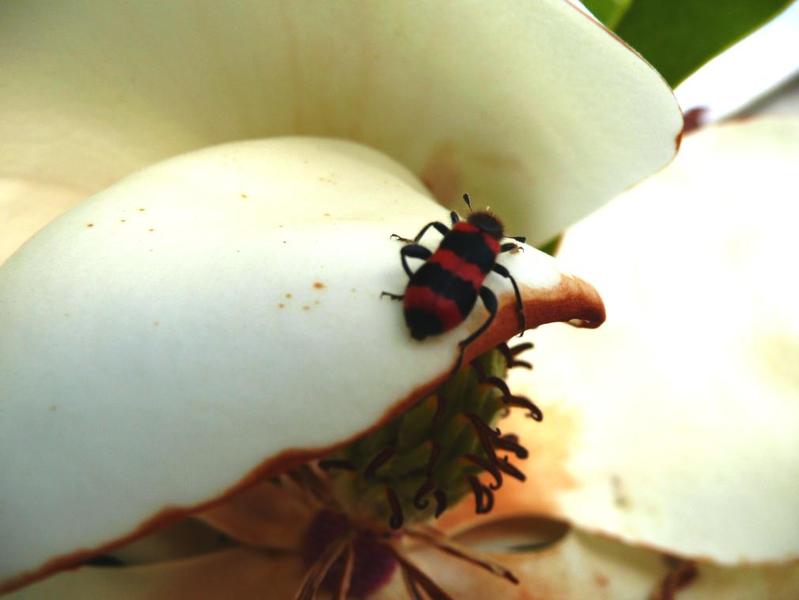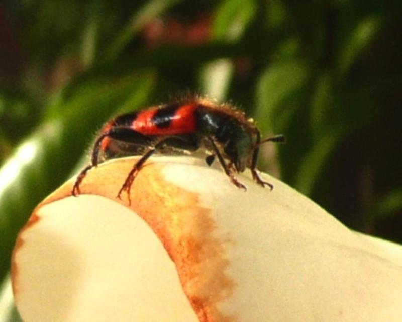 Der Besucher ist ein Bienenkäfer, Trichodes apiarius mal sehen ob er fleißig Pollen gesammlt hat und der Edith etwas behilflich war.