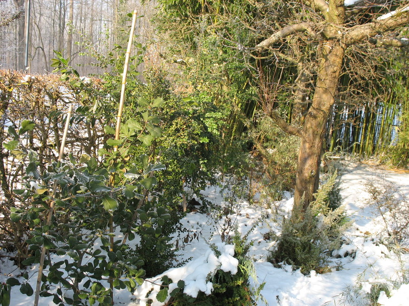 in dieser Rabatte (im Frühjahr 06 bepflanzt). Hinter Quercus reticulatus steht ein Sammelsurium ca. 20 chilenischer Gehölze dicht auf dicht - eine Katasstrophenpflanzung eigentlich, aber die mußten untergebracht werden. Ausfälle sind einkalkuliert