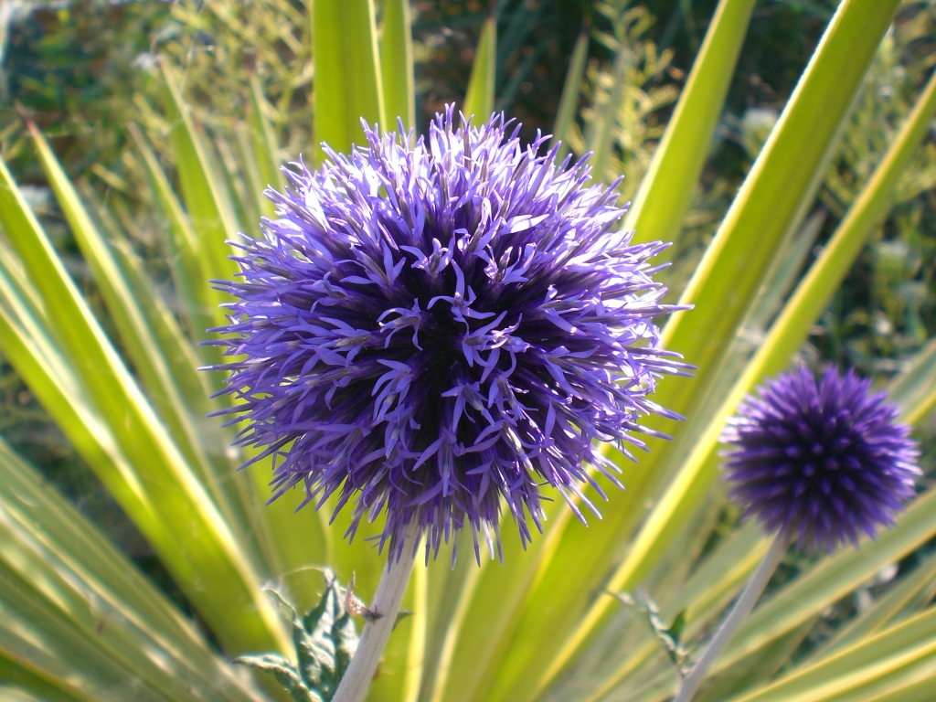 Echinpops ritro `Veitch's Blue´ u. Yucca aloifolia `Variegata´