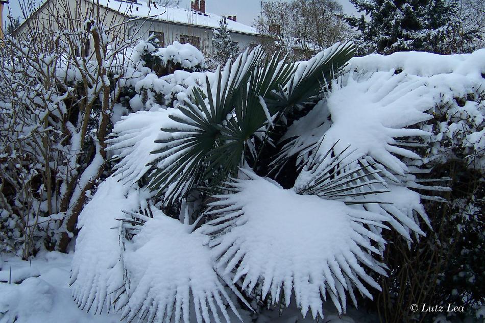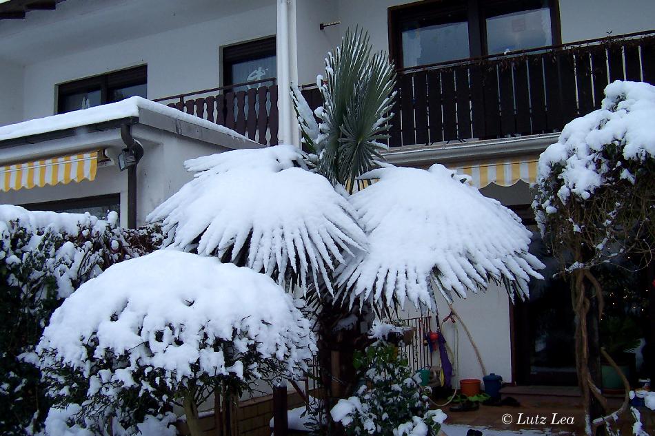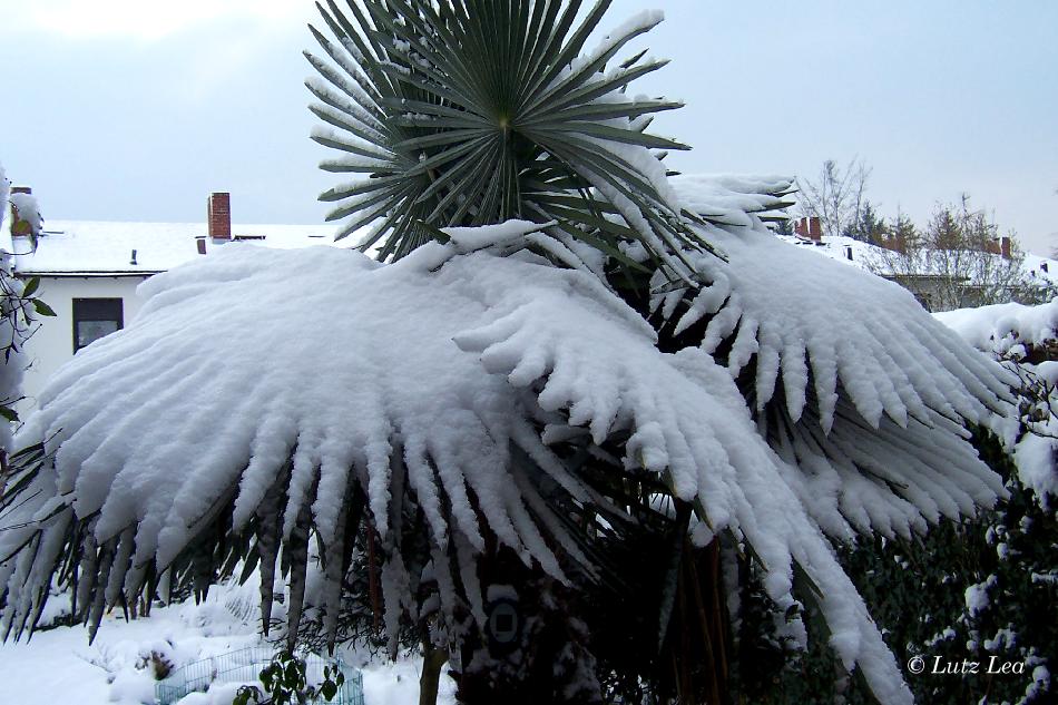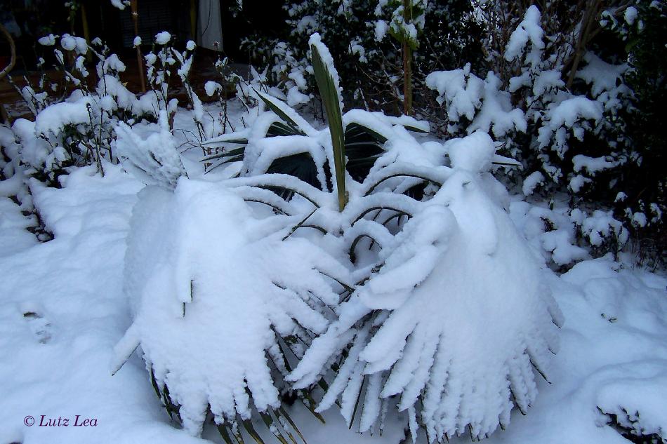 ist schon wieder verdammt spät, aber hier noch schnell ein paar Schneebilder vom Mittwoch Morgen, nachdem es in der Nacht fast pausenlos geschneit hatte. Auch der lockere Pulverschnee drückt dann in größeren Mengen die Fächer der Hanfpalmen ganz schön nach unten.