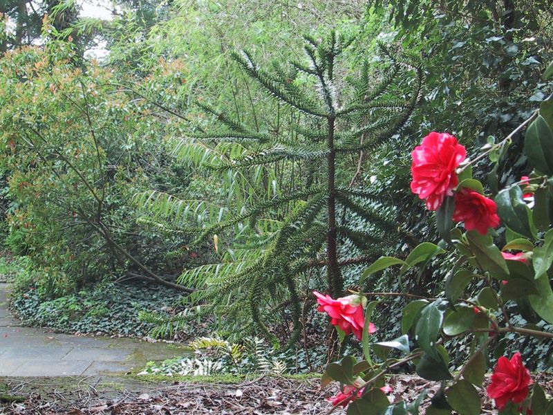 Absolut winterharte Camellia-Hybride vor Araucaria araucana und der immergrünen Stachyurus salicifolia