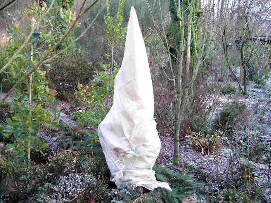 .. und hier das Kunstwerk „Klu-Klux-Klan“ geschaffen aus einer /*Quercus suber ‚Cambridge’*/. Links daneben Quercus x pseudoturneri, hinter der Skulptur Quercus phillyreoides (nur mit Mulch geschützt).