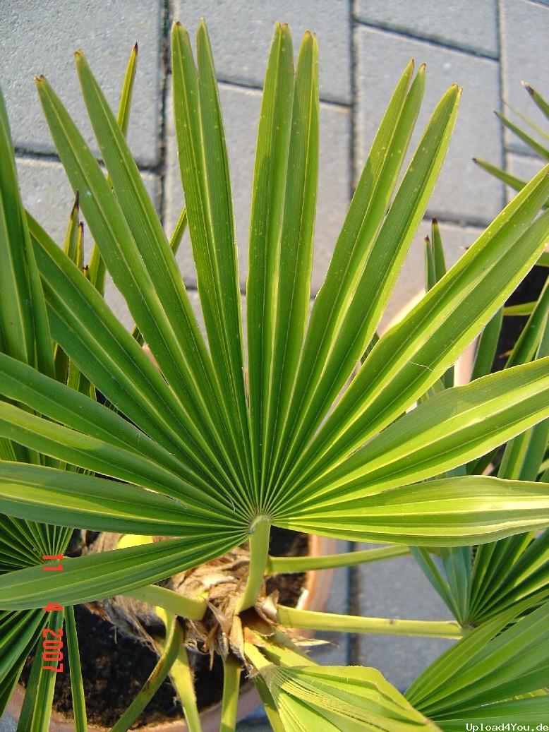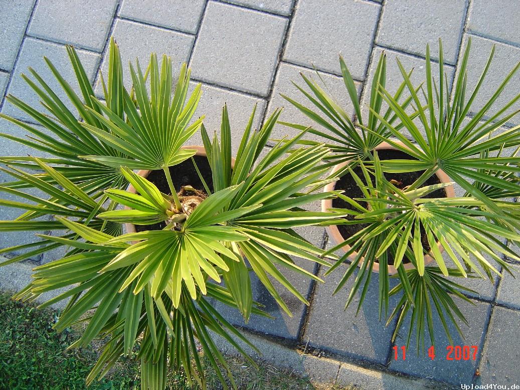 Rechts eine Trachycarpus aus unbekannter Herkunft (Samen von ebay). Diese hat immer paarweise zusammenhängende Blätter. Außerdem sind sie wesentlich härter und kompakter.