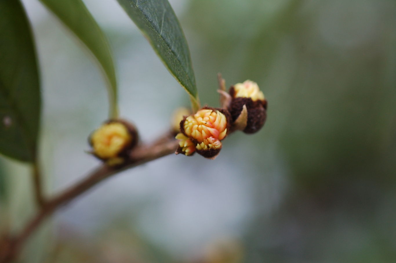 on gelb nach orangefarben entwickeln sich in den letzten Tagen die Blüten von /*Sycopsis sinensis*/, einem immergrünen Hamamelisgewächs aus Ostasien.#AM e