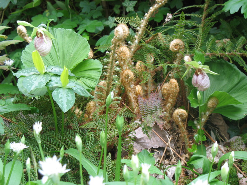 zur Zeit ist mächtig was los im Garten, insbesondere bei Kleinzeug. Hier im alten Schattenbeet auf der schmalen Nordseite des Hauses hat sich einiges zusammengefunden was so nicht kombiniert war. Fast 20 Jahre sind auch eine Zeit die gewisse Wanderbewegungen erlaubt: Tillium, Polystichum setisferum und Cypripedium japonicum. Der Bärlauch ist aus dem nahen Auwald eingewandert und macht sich breit.