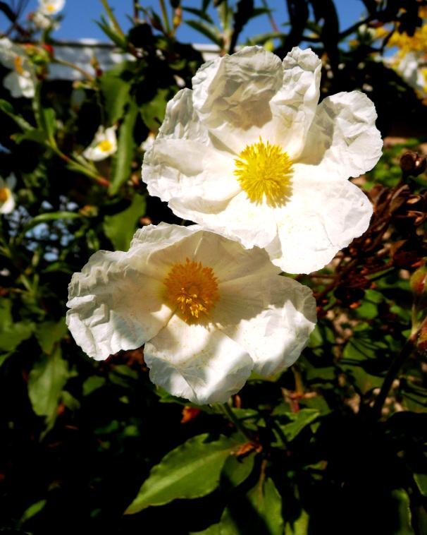 /*Cistus laurifolius*/ inzwischen sogar ca. 2 m hoch und nicht nur die Blüten sind beeindruckend, auch die alten abfasernden Stämmchen.