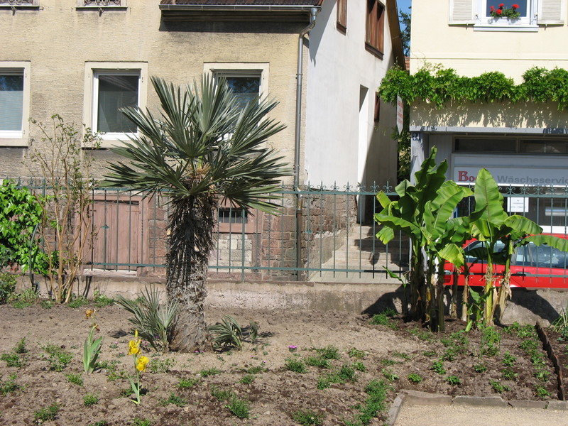 und eine Neupflanzung gibt es! Dort wo im letzten Jahr noch Punica granatum stand, steht unübersehbar ein /*Trithrinax campestris*/, gar nicht von schlechten Eltern. Würde sich auch bei mir im Garten gut machen!!! Der Granatapfel wurde nach hinten an den Zaun (nicht im Bild) verpflanzt. Außerdem gabs als Neupflanzung eine mittelgroße Cycas revoluta.