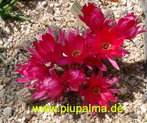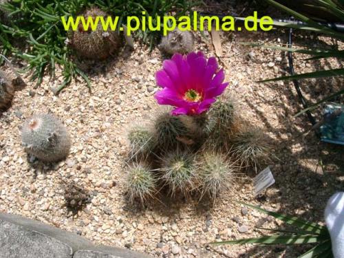 Das ist mein Echinocereus stramineus, mit riesiger Blüte. (Nebendran ein paar Notocactus als Größenvergleich):