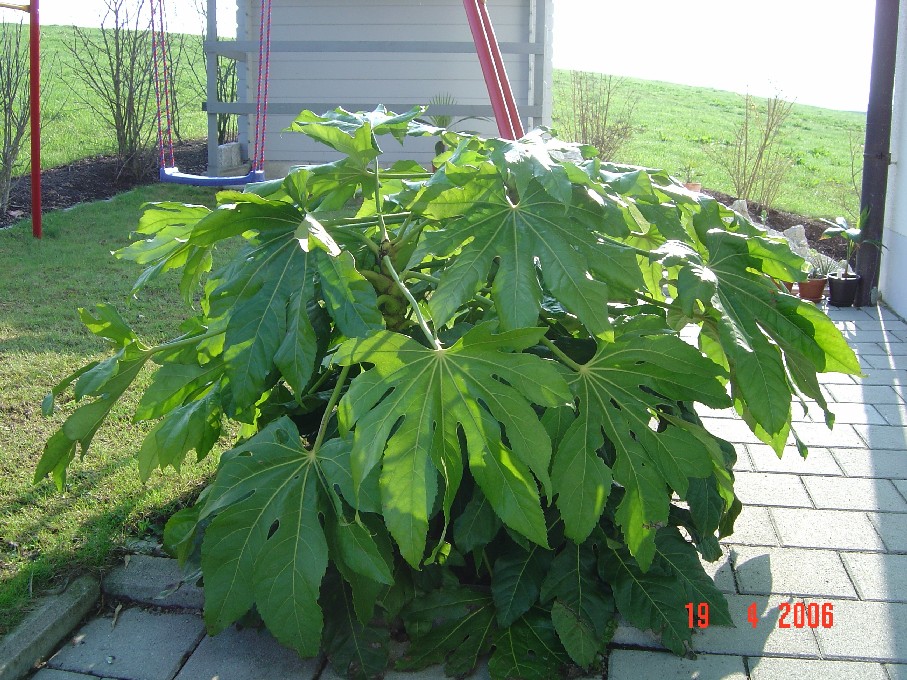 Schon erstaunlich, wie unbeschadet die 2004 ausgepflanzte Fatsia j. diesen langen und kalten Winter gemeistert hat. Winterschutz war nur etwas Vlies.