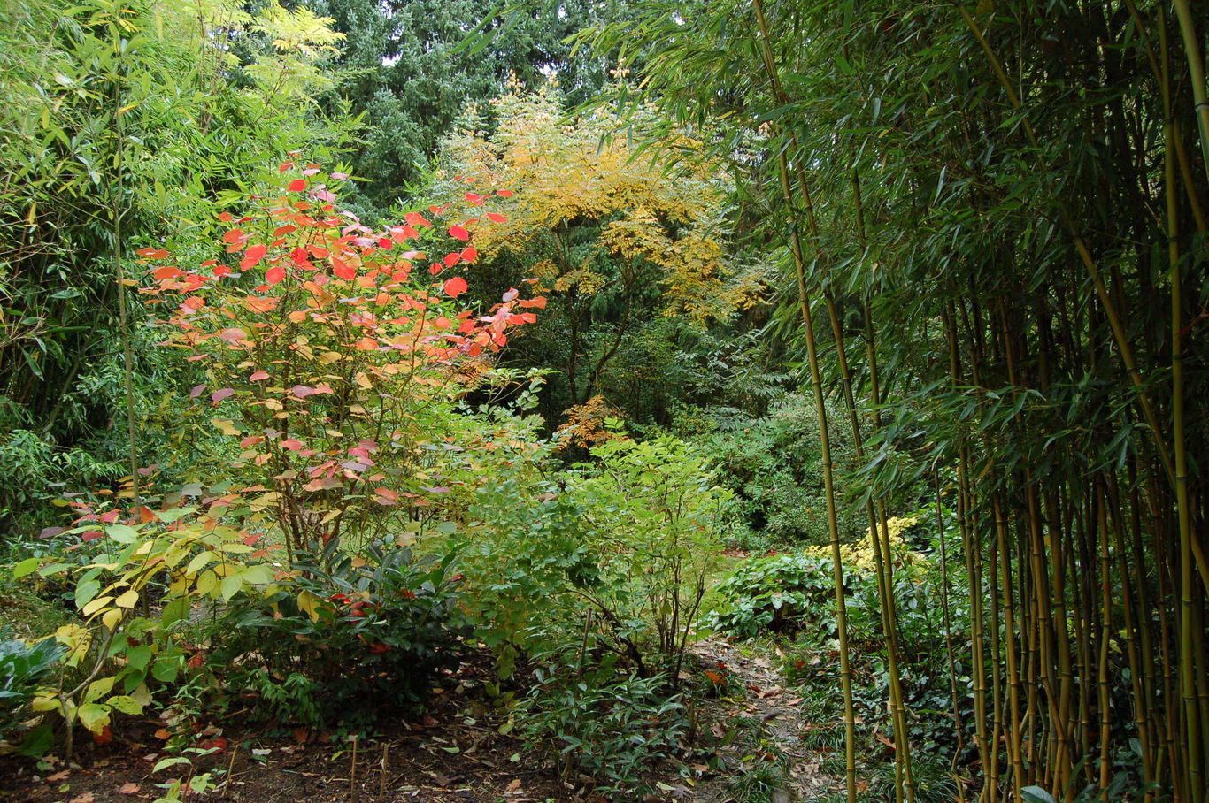 Hinten links Toona sinensis Flamingo, in der Mitte /*Koelreuteria paniculata*/, im Vordergrund /*Disanthus cercidifolius*/#AM