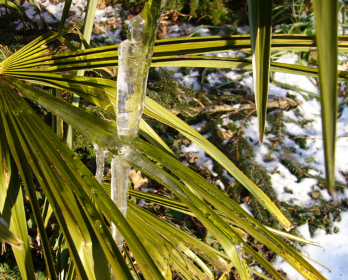 ...vulgo: Der Eiszapfentragende Trachycarpus. Er steht an der S�dwand des Hauses, wo es heute kurzfristig ueber Null Grad ging, inzwischen wieder -6,5 Grad, Tendenz weiter fallend.