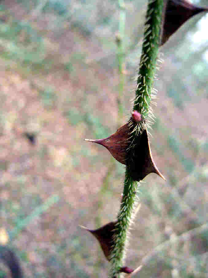 ..und hier die "Stacheldraht-Rose" (/*Rosa sericea f. pteracantha*/) nit ihren flossenartig verbreiterten Stacheln. Die Redensart "Keine Rose ohne Dornen" müsste eigentlich korrigiert werden in "Keine Rose mit Dornen" (sondern mit Stacheln).