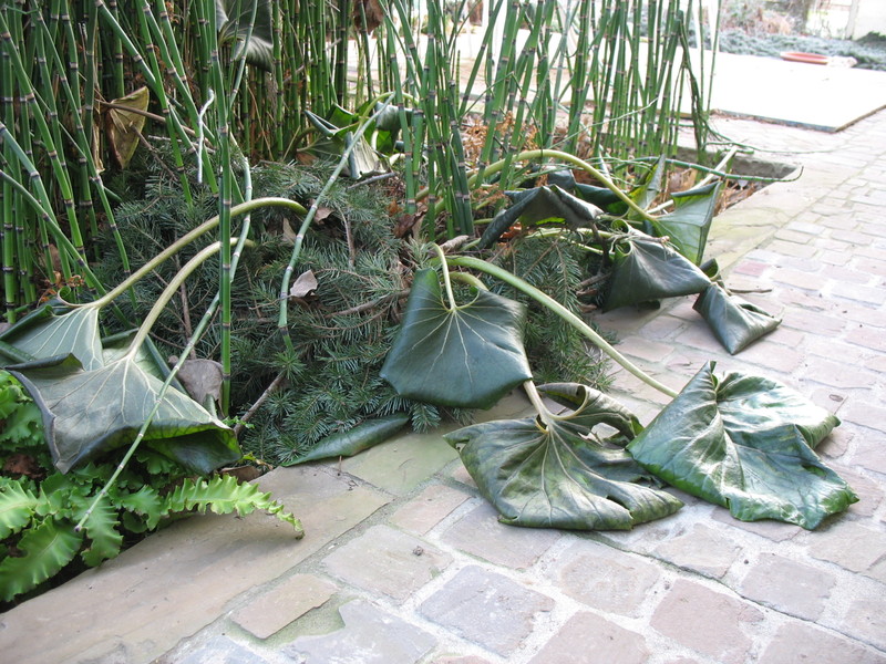 sieht Farfugium japonicum seit ein paar Tagen aus. Ob sich die Blätter wieder aufrichten oder zu Matsch werden hängt von Dauer und Stärke der Kälte ab, wie sich die letzten Jahre gezeigt hat.