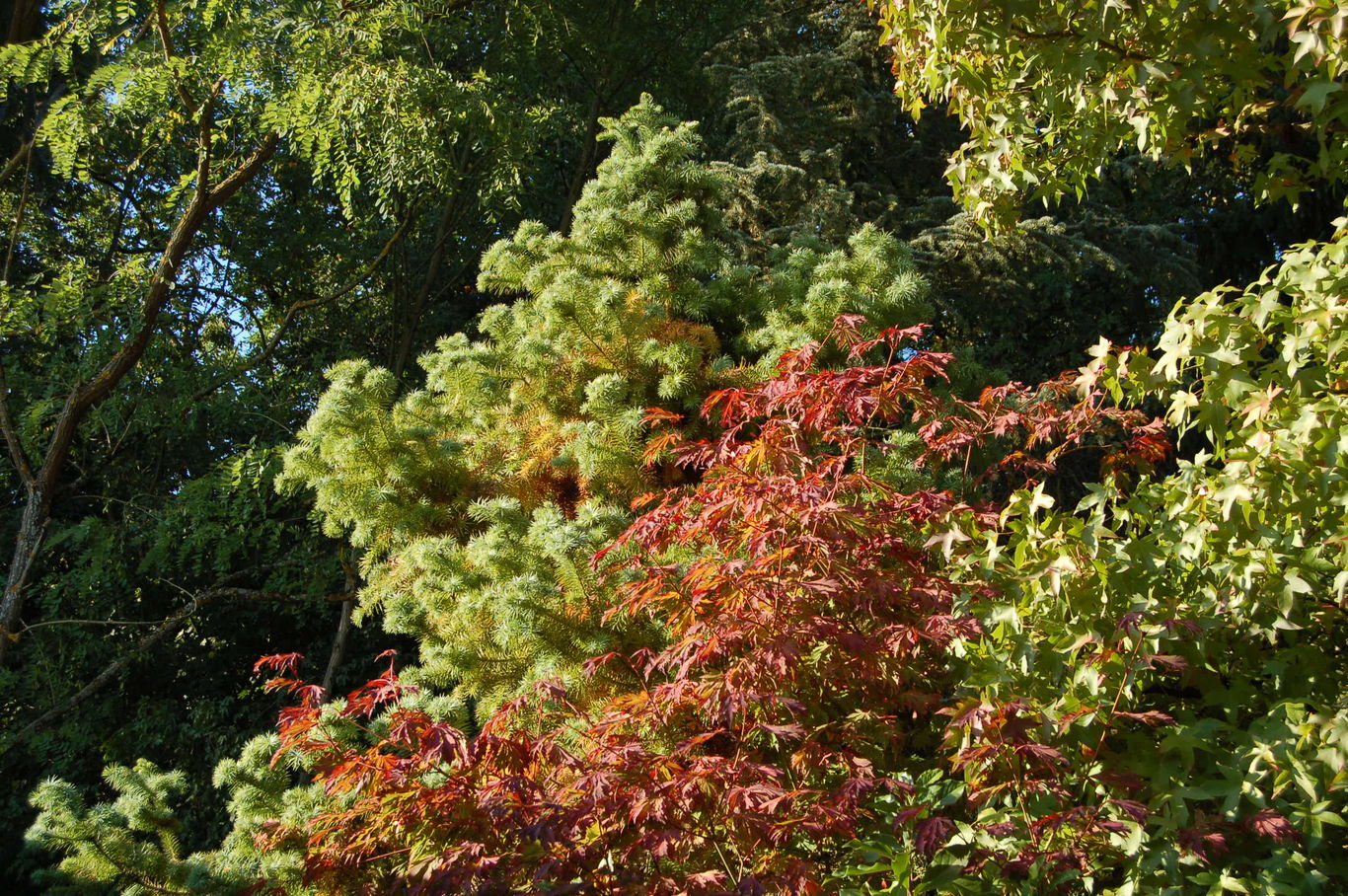 mit der frühesten Herbstfärbung ist wohl /*Acer japonicum Aconithifolium*/ einer der ersten!#AM Hier vor Cunninghamia lanceolata (ca. 6m hoch)