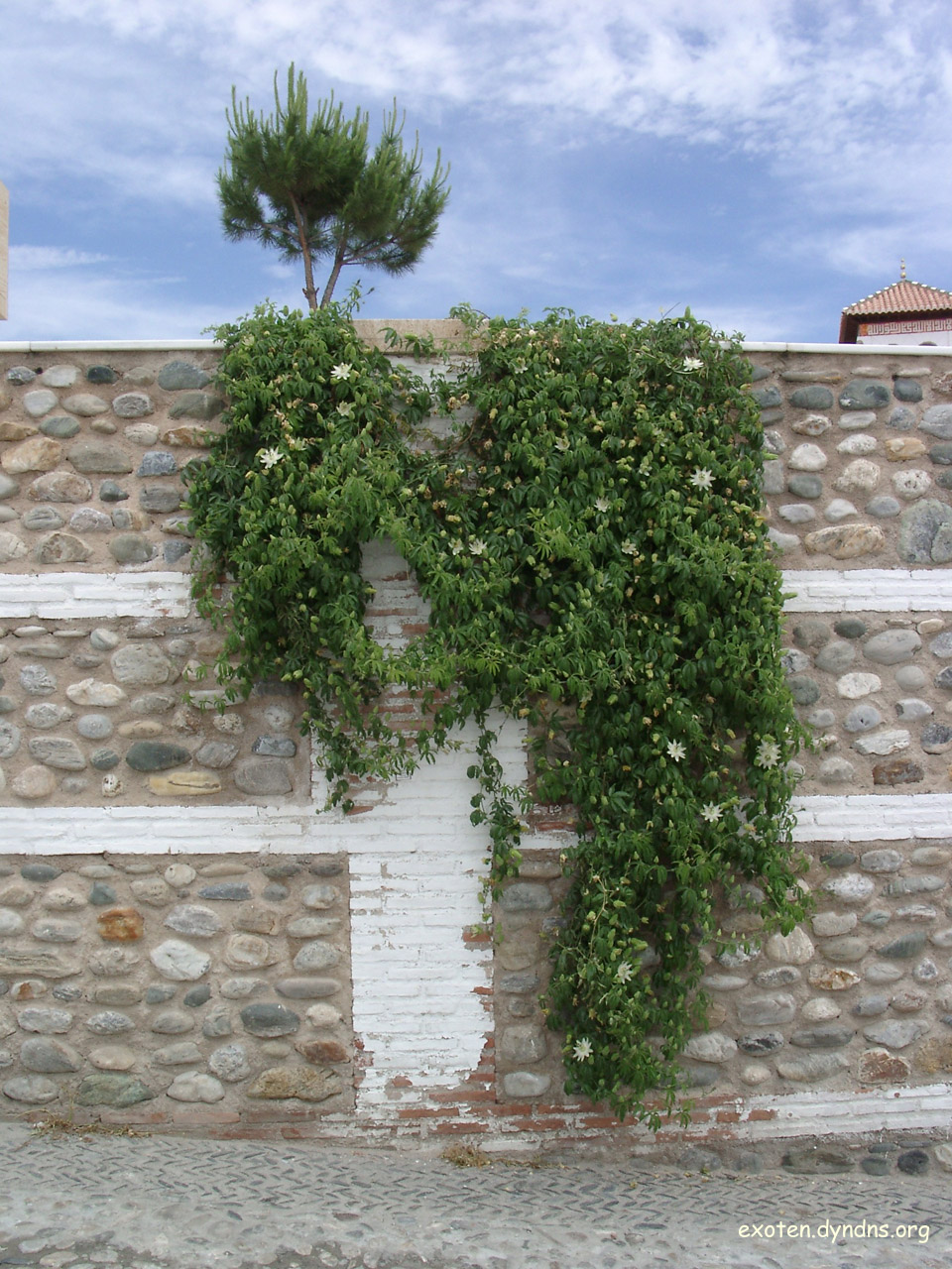 Es geht auch von oben nach unten - an der Mauer der Moschee eine Passiflora carulea "Constance Elliot"