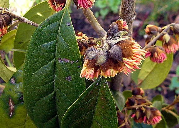 sicher, es gibt *Knalligeres* im Garten als diese immergruene Art aus der Zaubernuss-Familie (Hamamelidaceae). Aber ein bluehendes Exemplar ist dennoch ein typischer Hingucker.