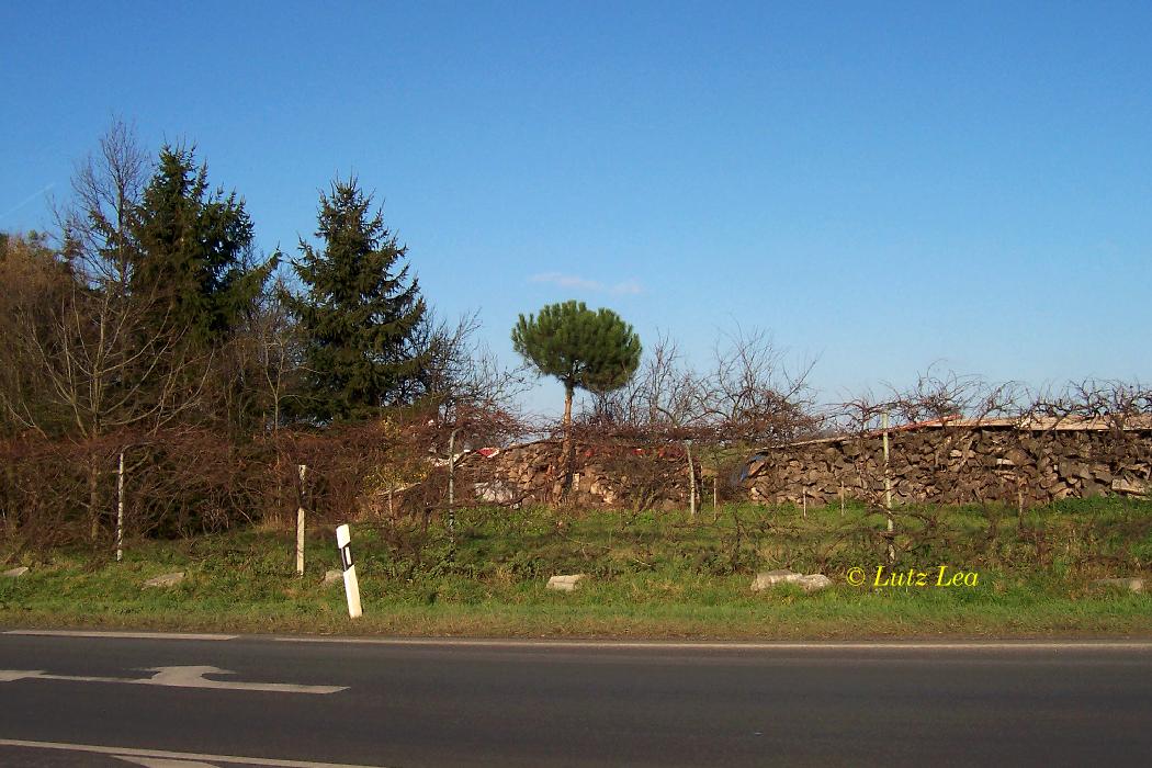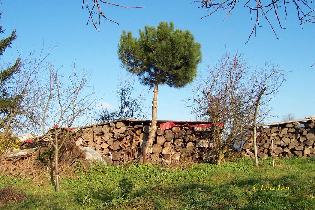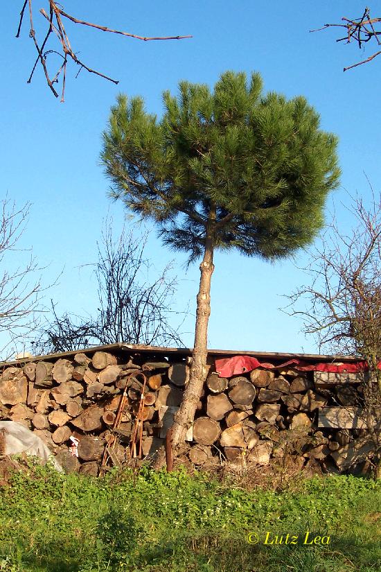 als wir heute Vormittag zu einer verabredeten Urweltmammutbaumvermessung in Harheim (im Norden von Frankfurt am Main gelegen) unterwegs waren und die Homburger Straße bei Nieder Erlenbach lang fuhren, viel mir rechter Hand in einem Minigarten diese ca. 10-12 Jahre alte Mittelmeerpinie 'Pinus pinea' auf.